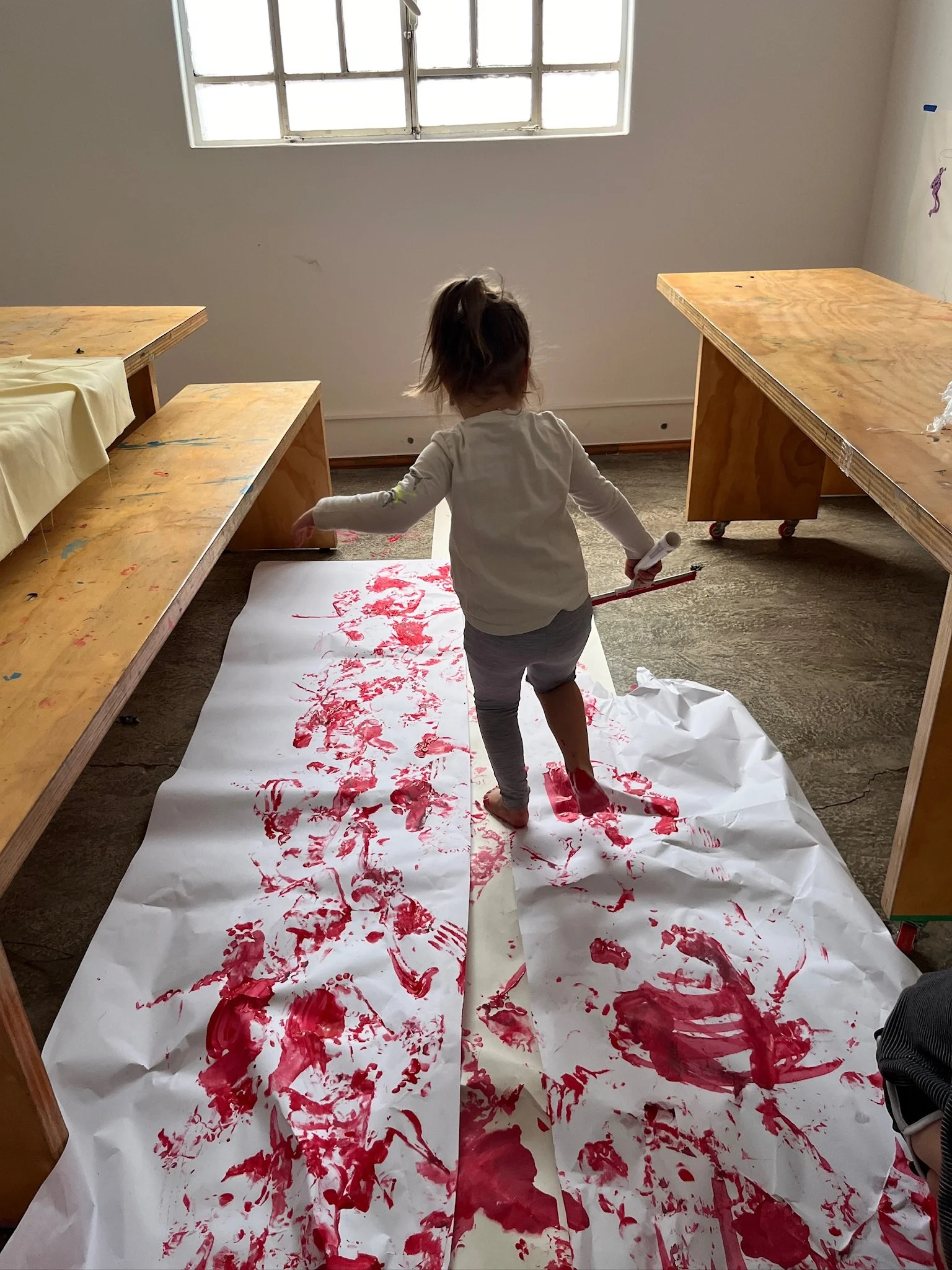 A young girl with a ponytail, wearing a white long-sleeve shirt and gray pants, is walking barefoot on a large sheet of paper with red paint footprints and handprints, in a room with wooden tables and a window.