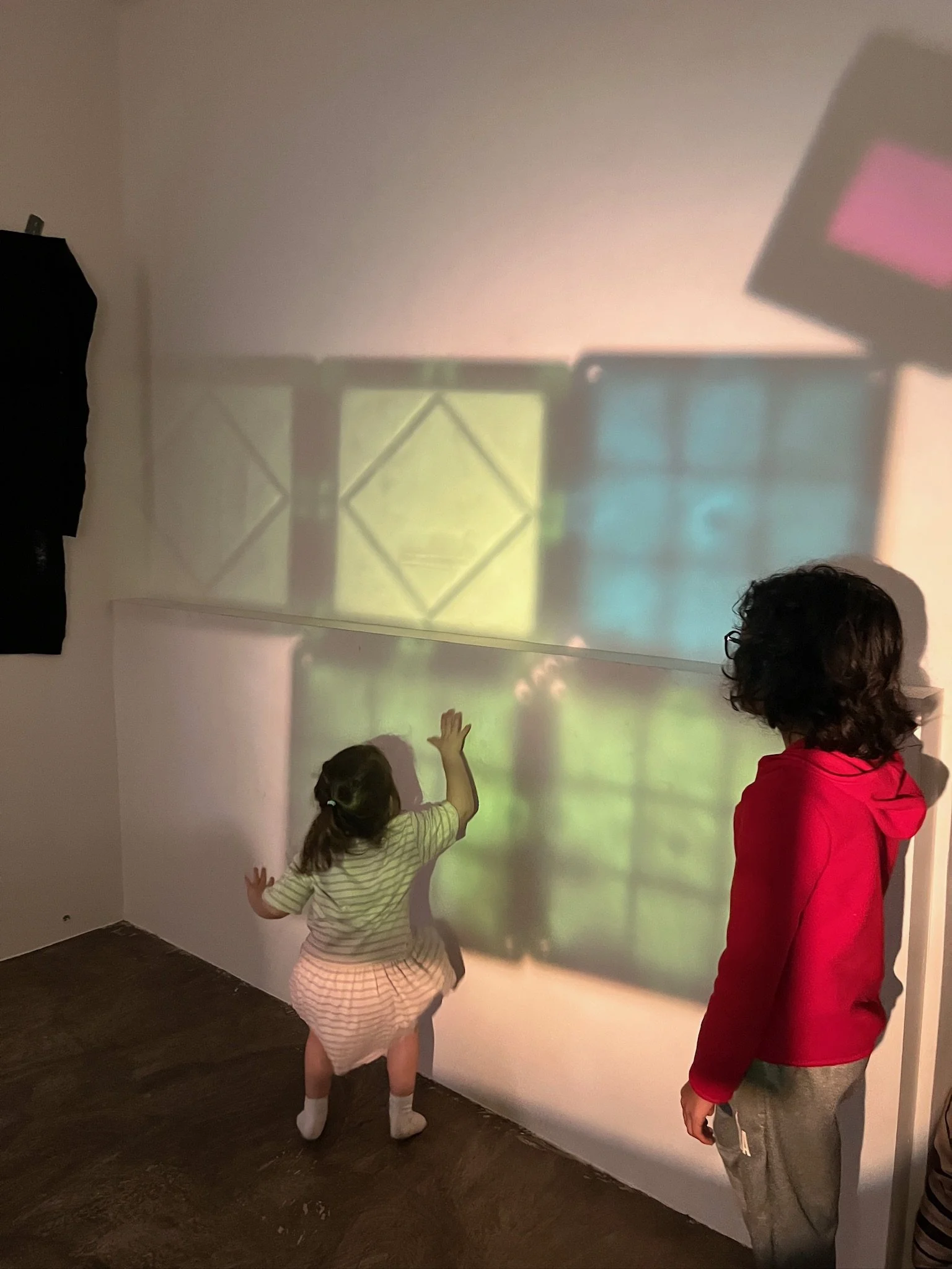 A girl with pigtails wearing a striped shirt and pink skirt presses her hand against a wall with projected images of colored windows. A person with curly hair and a red hoodie stands nearby observing.