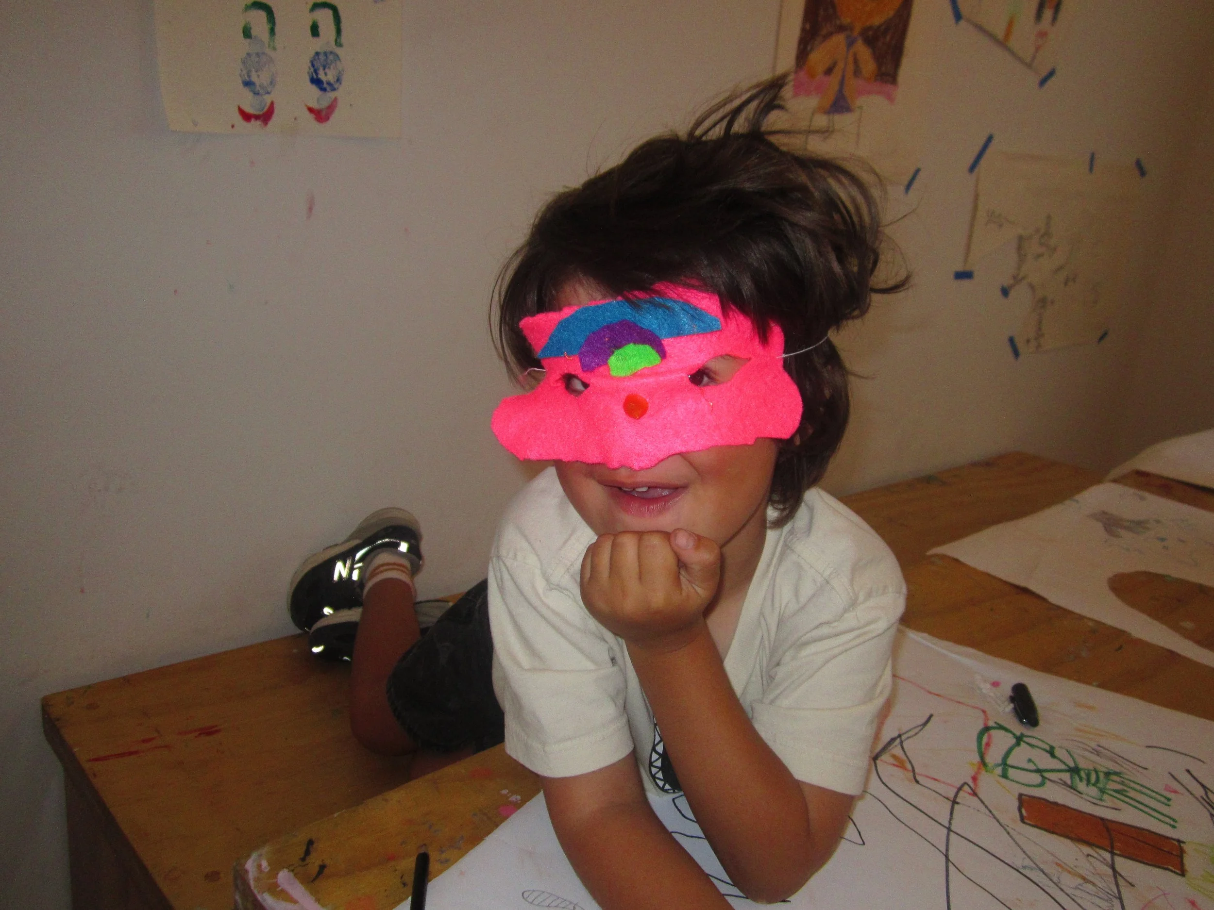 A young boy lying on a wooden table with his chin resting on his hand, wearing a pink felt mask with colorful attached details, surrounded by drawings and art supplies.