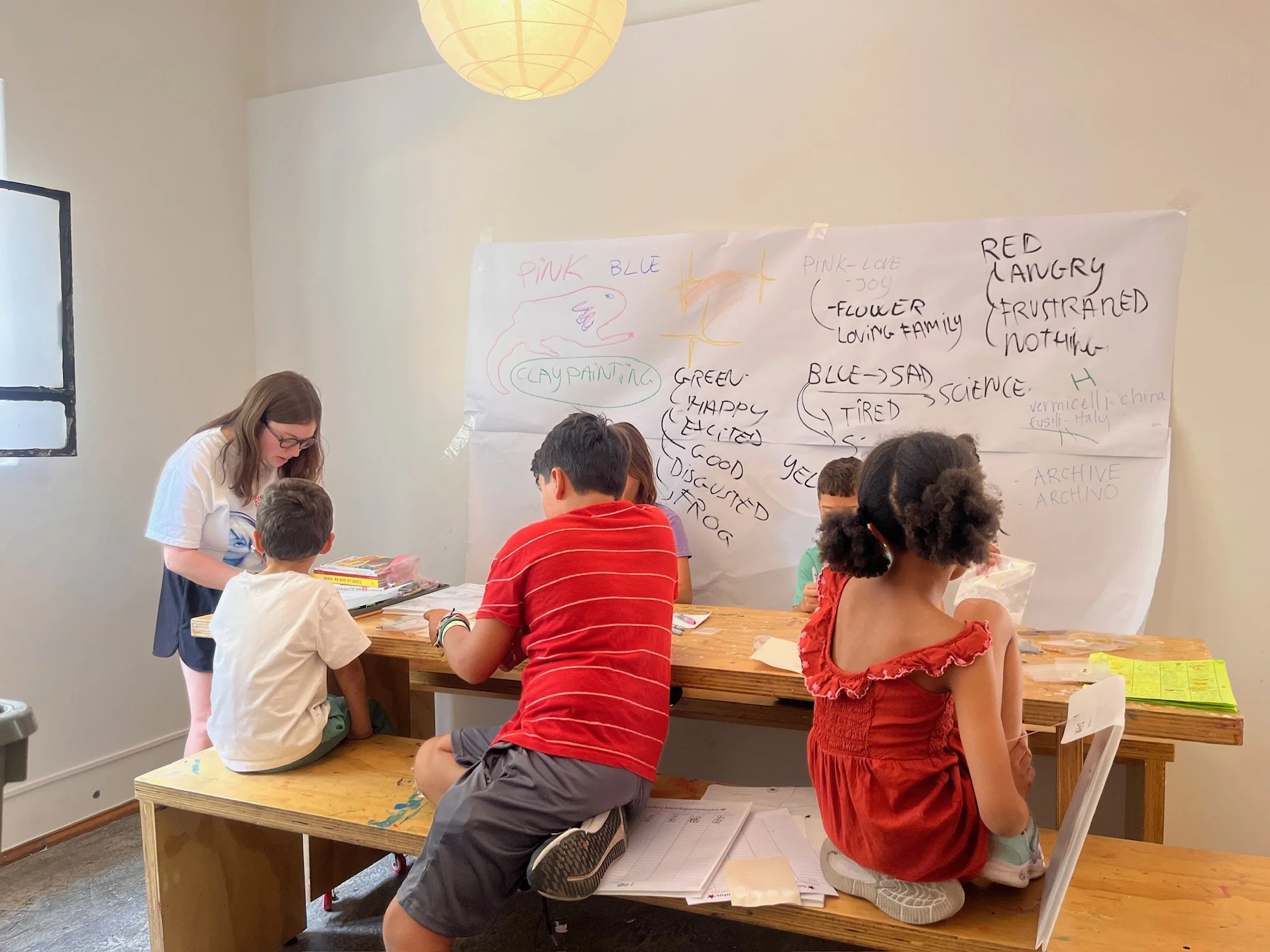 A group of children and a young woman are gathered around a wooden table in a classroom, working on a project. Behind them, large sheets of paper with handwritten notes and drawings cover the wall, featuring words and phrases related to colors, emoti