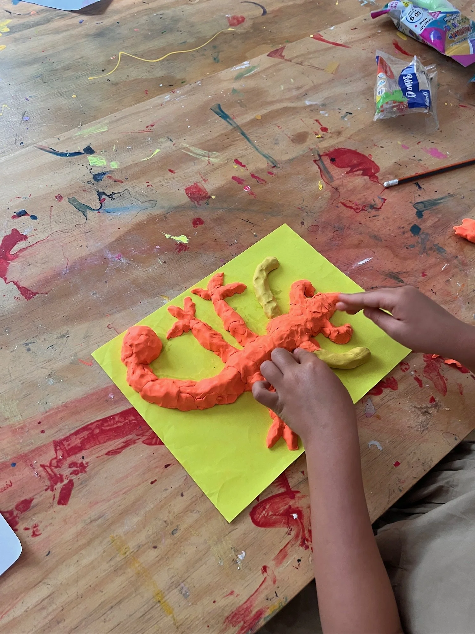 A child is shaping orange and yellow modeling clay into a colorful spider and other shapes on yellow paper, on a messy wooden table with paint splatters and art supplies.
