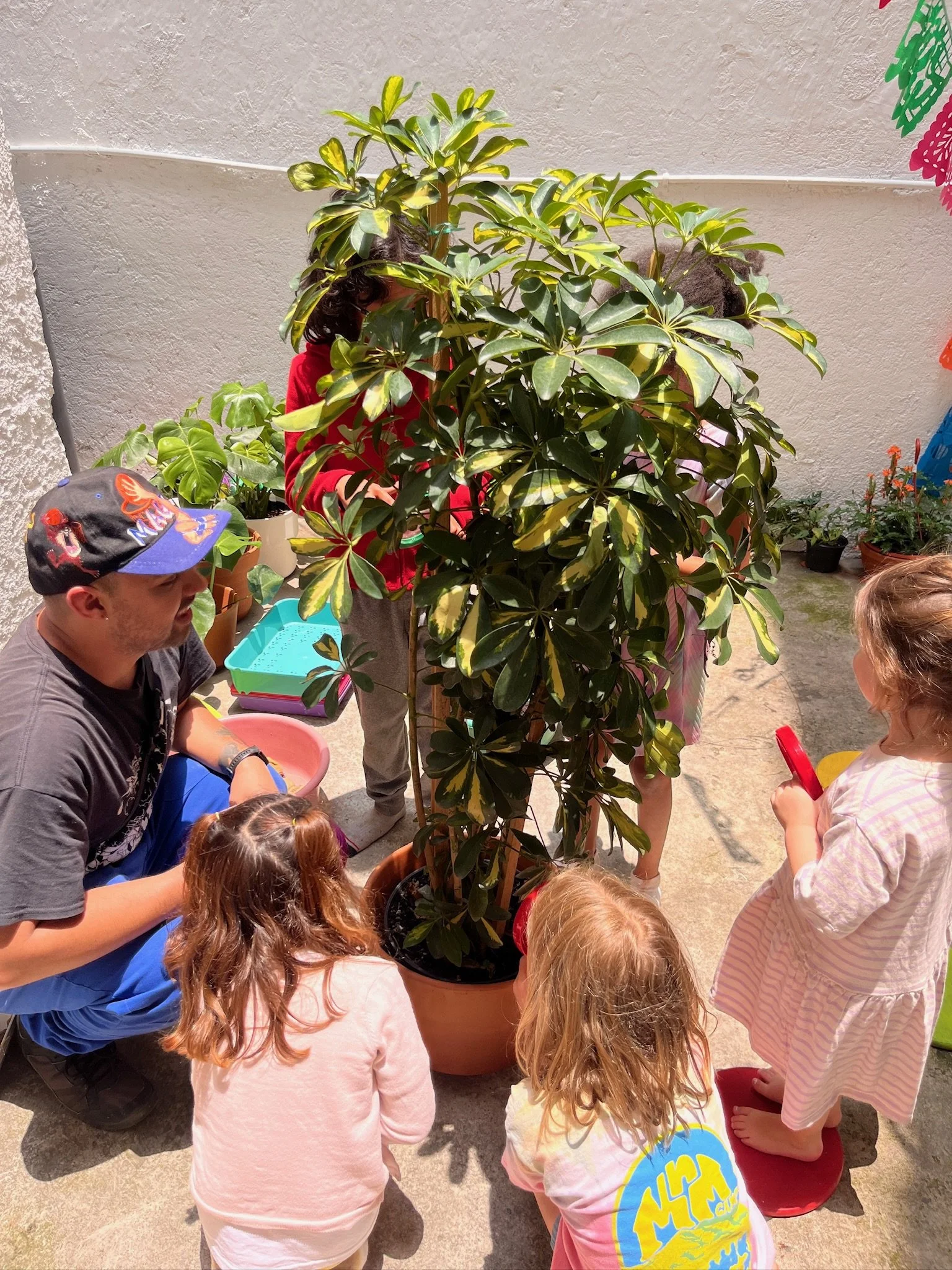 Children gathered around a large potted plant outdoors on a sunny day, some sitting and some standing, with a white wall in the background, participating in a gardening or plant activity.