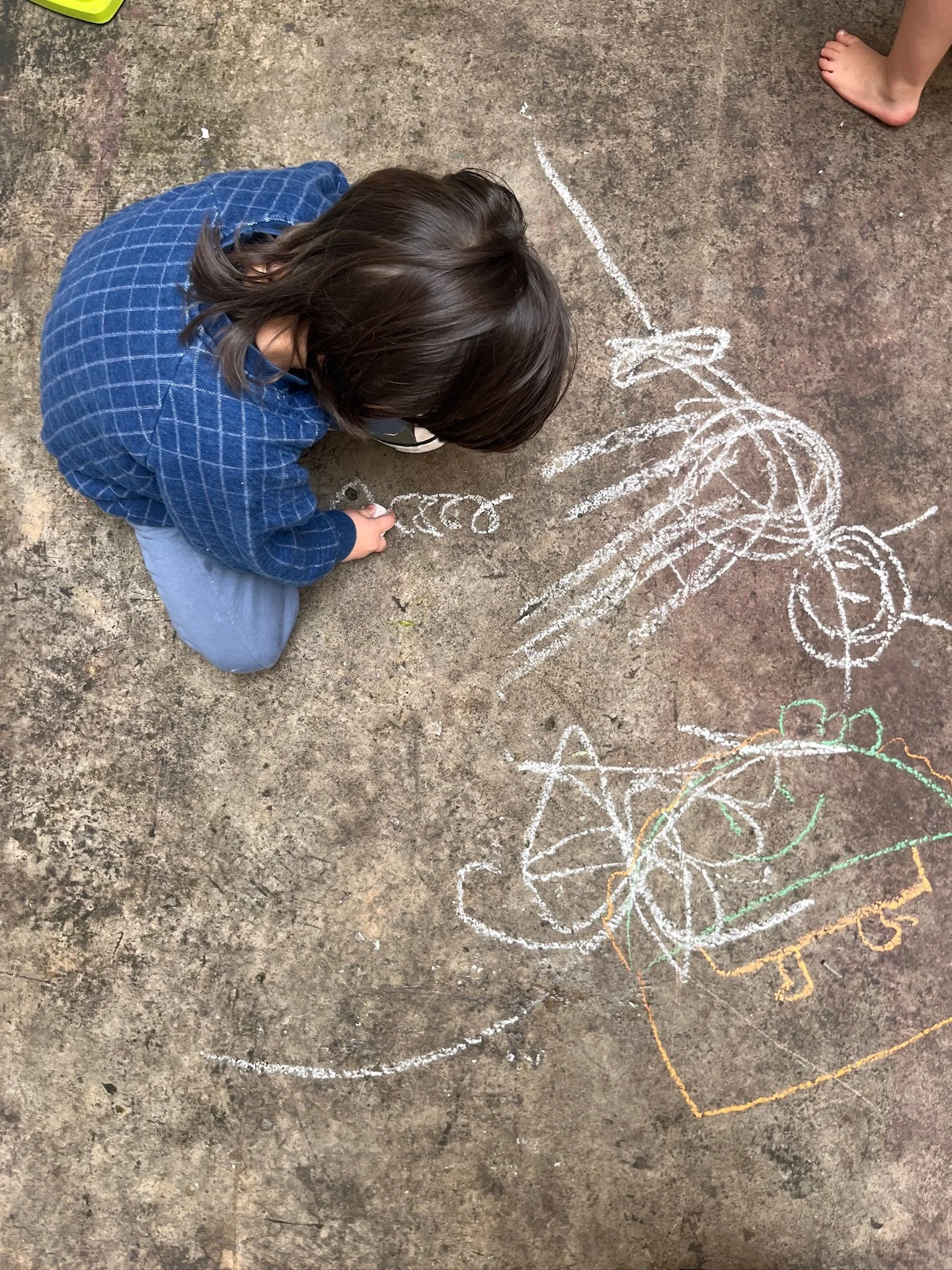 A child drawing with chalk on the ground, creating colorful sketches of a turtle, a cone, and a ball, with another child's bare foot visible in the background.